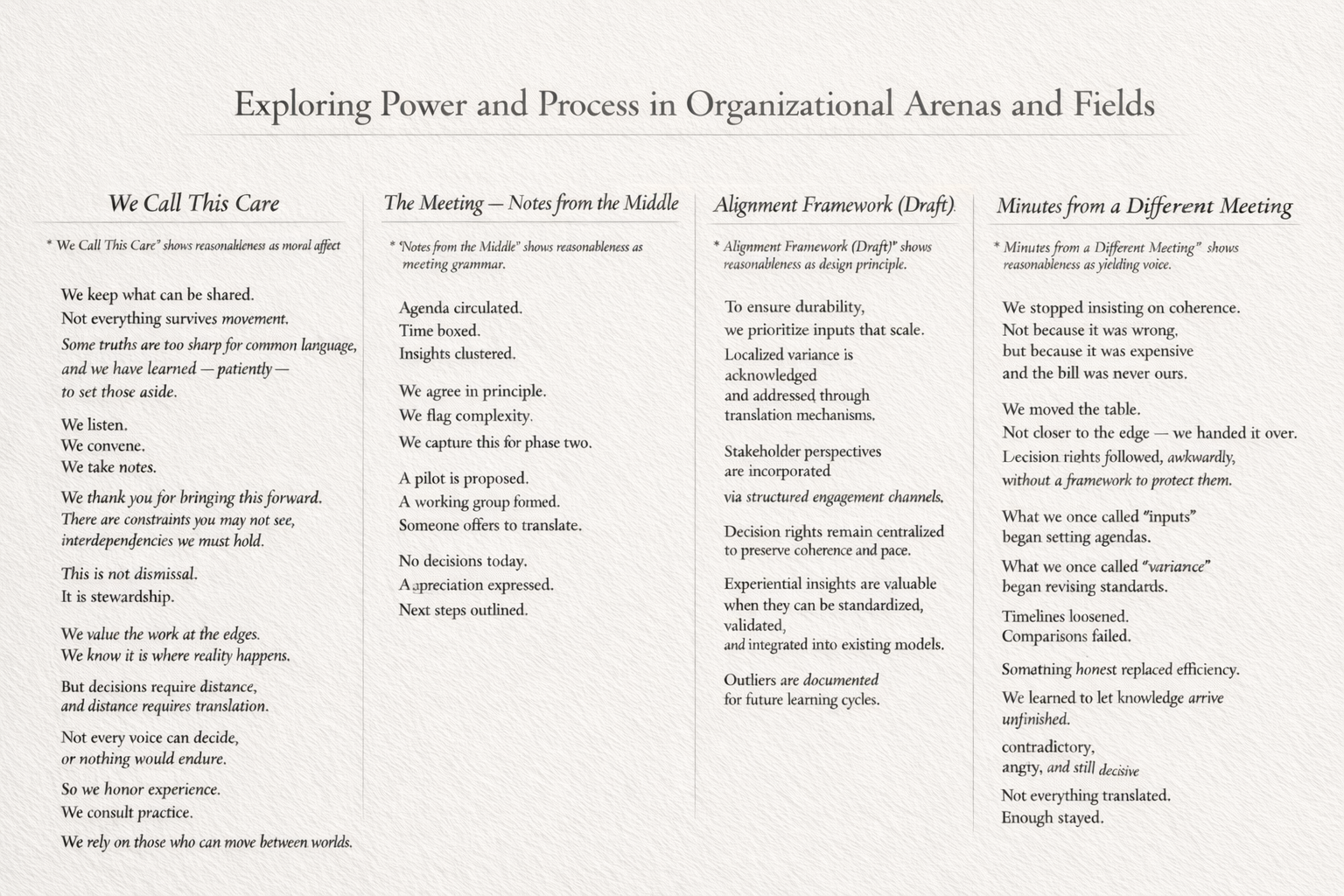 Legitimacy Games - who gets to define what is “real” “promising” “serious,” “rigorous,” “field-level” and yes “legit” :-) What is ‘filtered out’ or soften (lived contradiction, ethical discomfort, and negative capability)because it threatens ‘legitimate’ coherence.